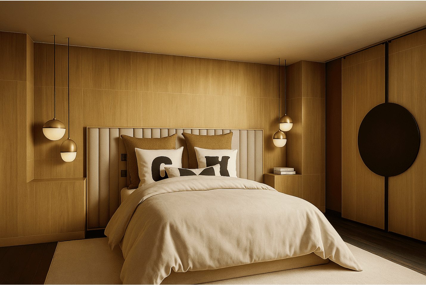 - desmenuiseries sur-mesure aux détails soignés : poignées dorées, inserts graphiques, lignes galbées