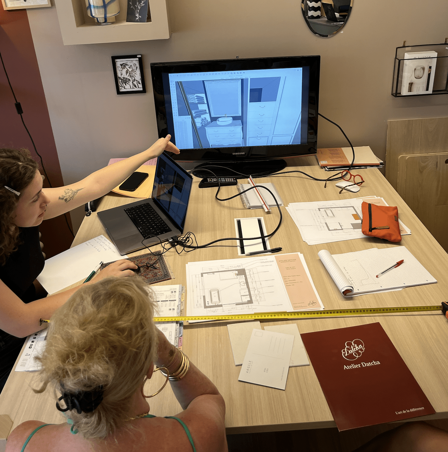 Pendant ce RDV, je vous donne ma lecture de l’espace, ce que je projette d’une part, une fourchette estimative du budget, ce que cela demande comme intervention (corps d’état, planning) des mes entreprises partenaires.