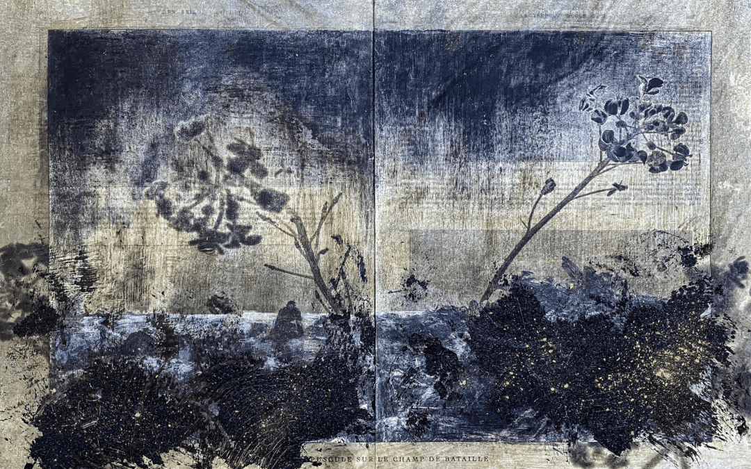 Techniques mixtes : photographie, archive extraite de L’Album de la guerre (L’illustration 1923). Lavis, pigments, cire.